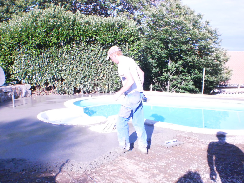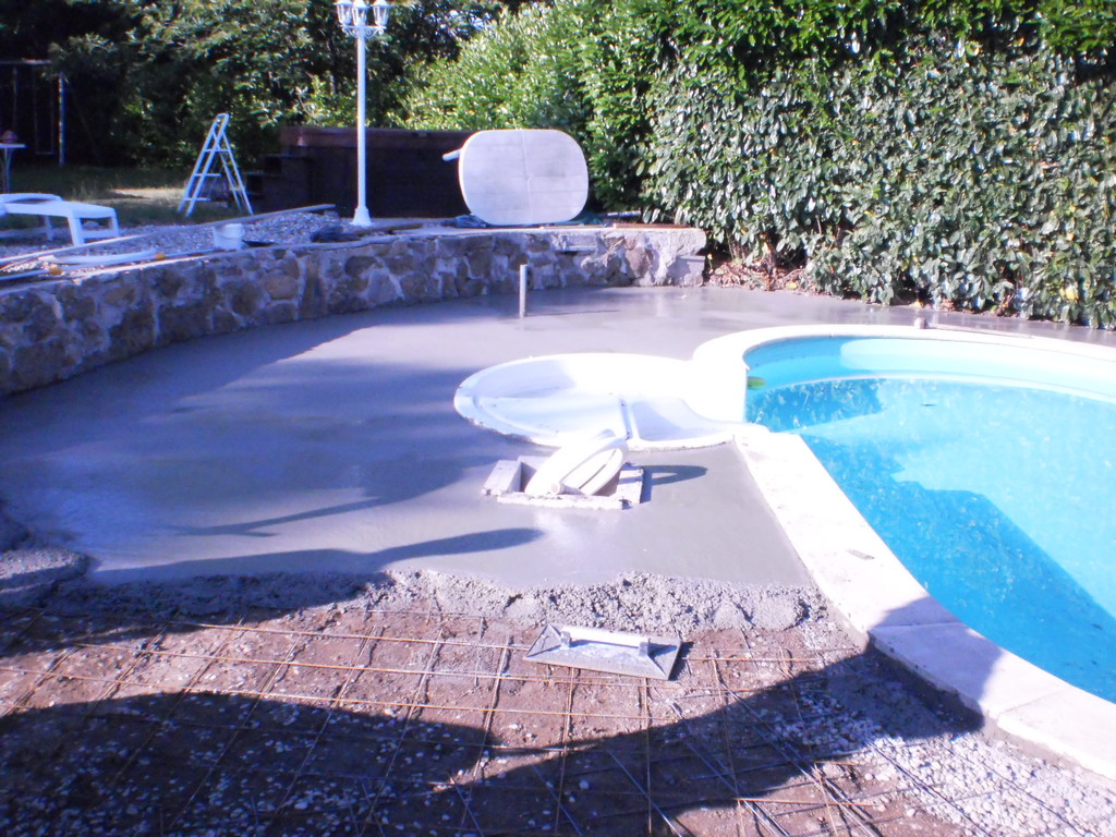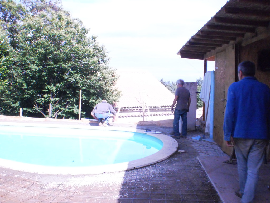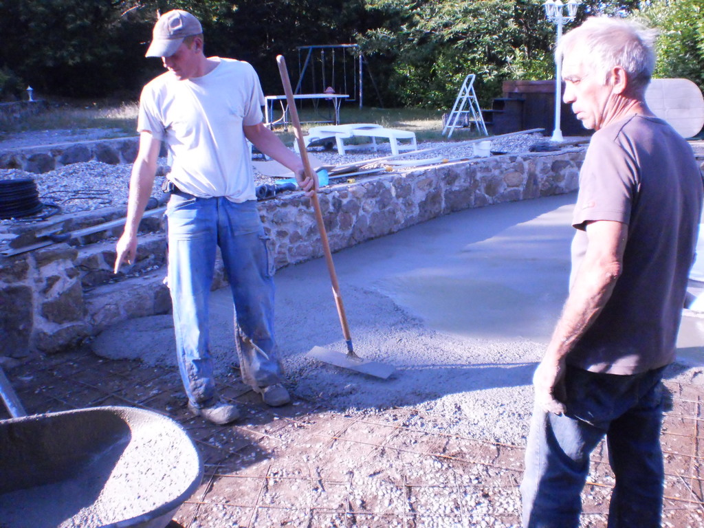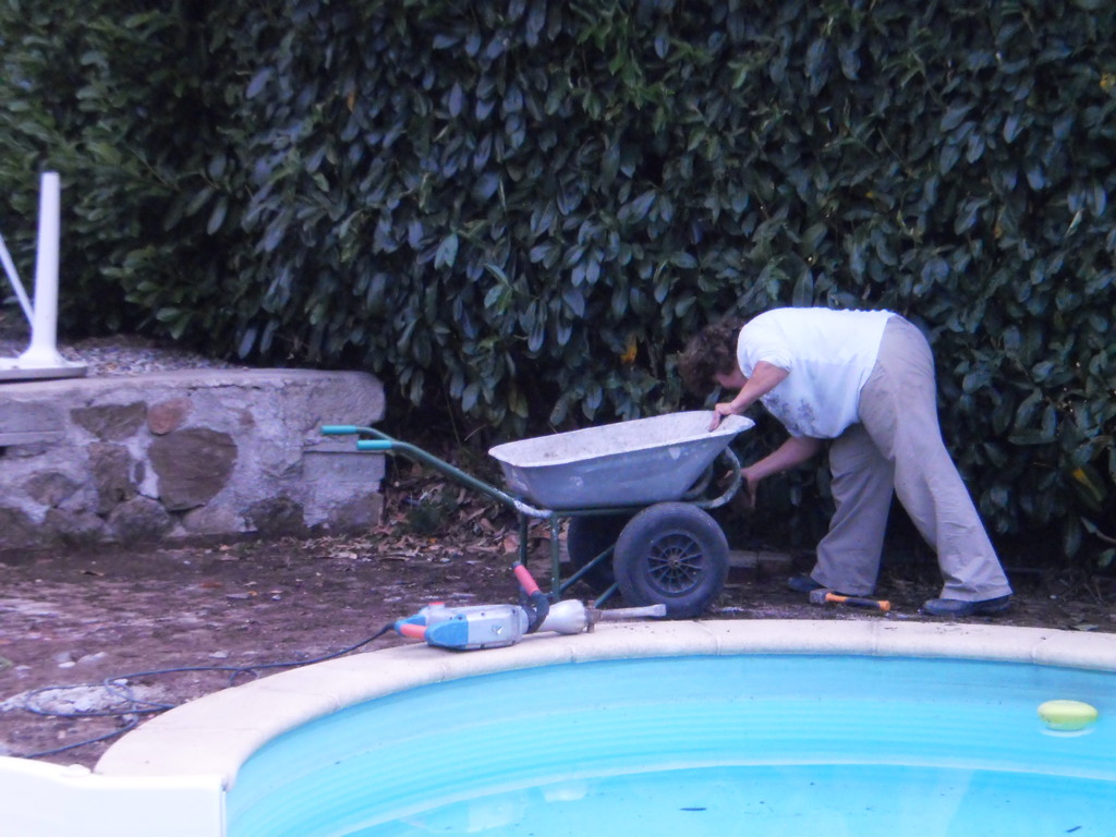 Nachdem die Umrandung nun zum 3. Mal gemacht werden müsste, und der Steinkiesboden für Mameli nicht so angenehm ist sowie die Filterpumpe durch eine Sandfilteranlage ersetzt werden muss, haben wir uns entschlossen nun den ganzen Boden zu betonieren. Am 31.5.2011 habe ich damit begonnen die Pflastersteine rund um das Schwimmbad zu entfernen sowie den Kies auf den oberen Boden zu verteilen. Danach mussten auf der unteren Seite des Bades Fundamente gegraben werden, damit das Ganze auch richtig stabil wird. Die Sandfilteranlage wurde am dem 3.6.2011 in Angriff genommen. Am 8.6.2011 nahm Claude die bisherige Arbeit ab und gab die Betonierung frei. Ab 18.00 Uhr trafen alle Helfer pünktlich ein und es begann rucki zucki. 2 Stunden später war das Werk vollbracht. Ich durfte dann noch die Dilletations-Fugen machen ( was für ein Staub ), den Geräteraum einrichten und sonst noch so die Restarbeiten mit Mameli beenden. Am 25.06.2011 fand das Ganze einen krönenden Abschluss mit einem Grillabend welcher feucht fröhlich seinen Abschluss fand.