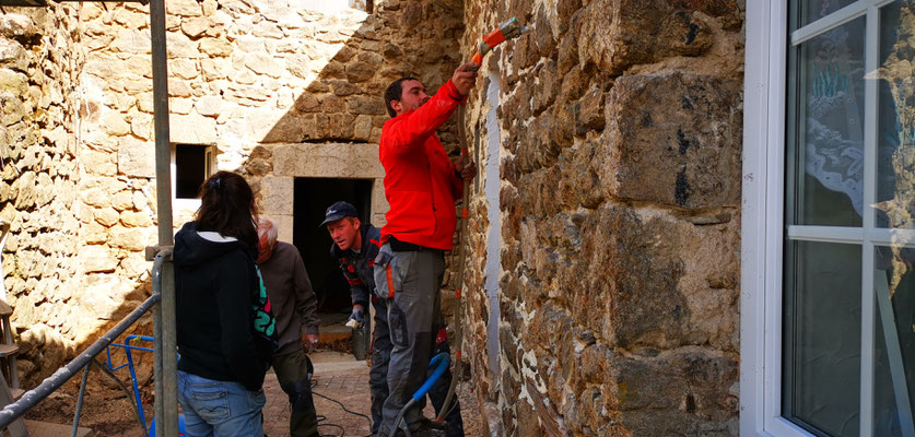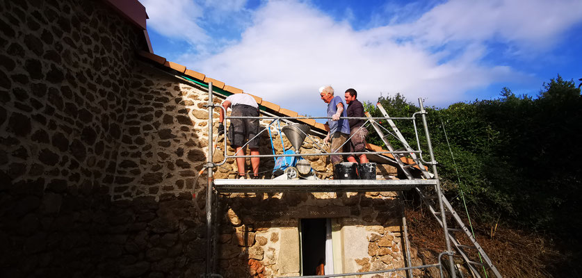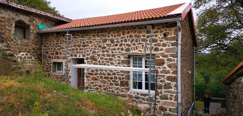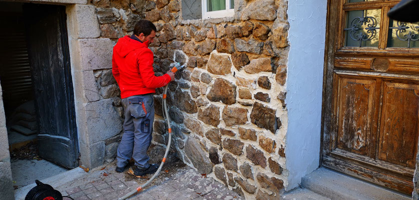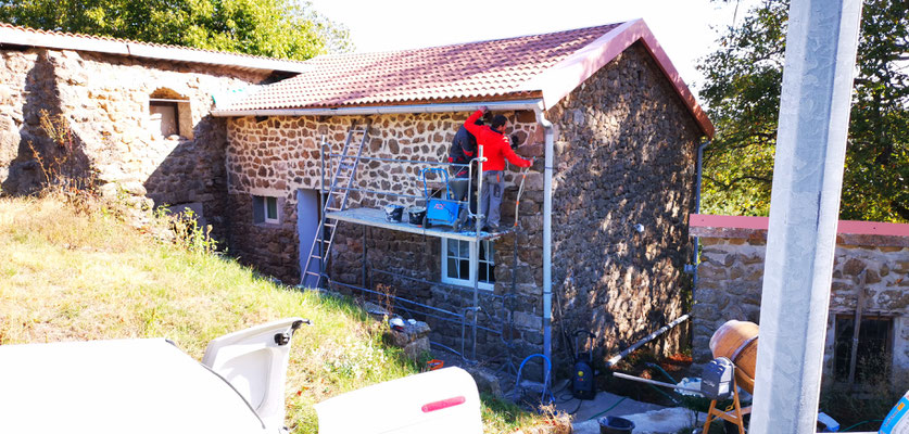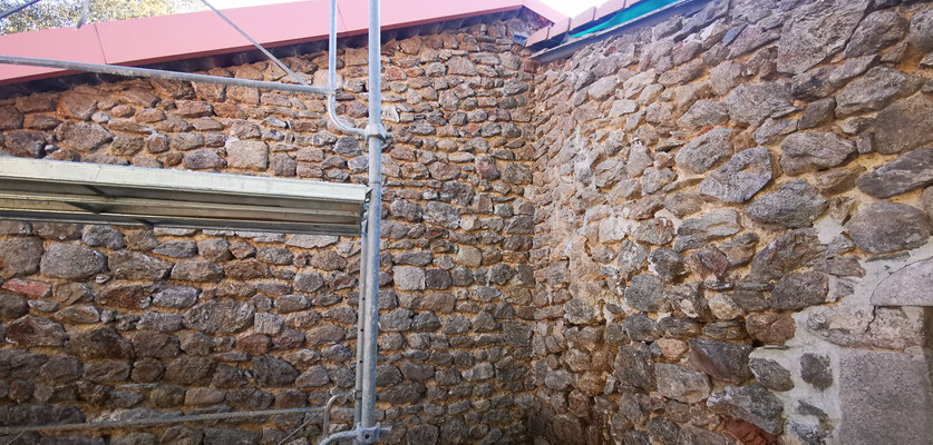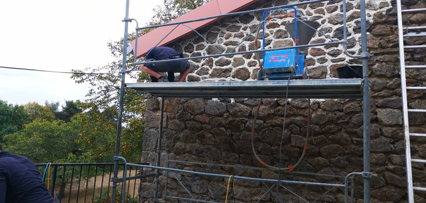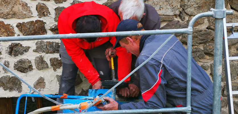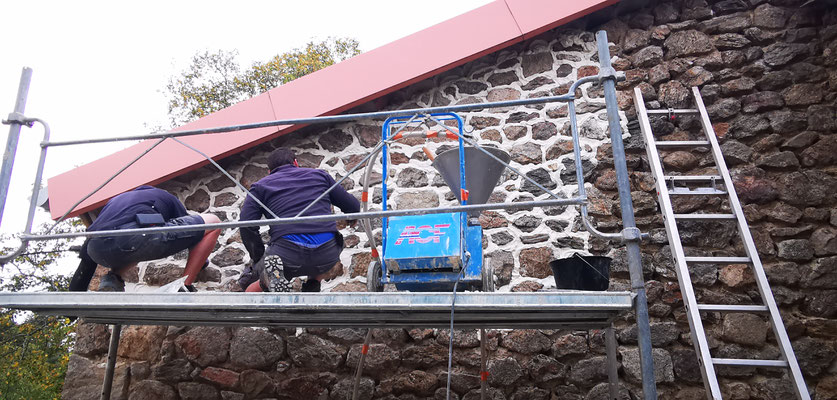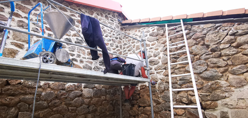 Am 20. September begann er mit der Renovation der Mauer oberhalb des Essraumes welche gemacht werden musste weil, bei Regen das Wasser durch die undichten Ritze runter lief in den Essraum. Dieser war dann sehr feucht. Mann musste also die Fugen alle 2-2,5 cm tief entfugen um dann mit der Fugenmörtelmaschine neu zu verfugen. Er bereitete alles vor, heisst: alter Mörtel rausspitzen, abdampfen und zusammenputzen sowie Baugerüst besorgen und aufstellen. Giom mit Bruder und Clod kamen dann um die Fugen zu füllen, wobei er und Clod den Mörtel zubereiteten und transportierten und Giom mit Bruder das Material verarbeiteten.