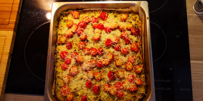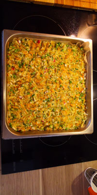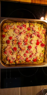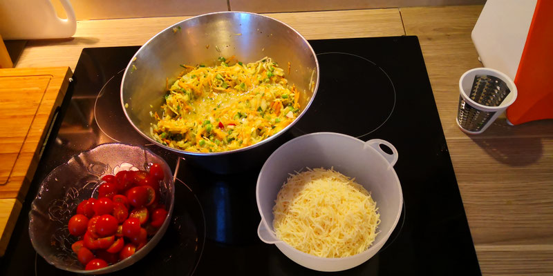 Tag 6: Ein Gemüseauflauf laut Manuela. Zuchini, Karotten, Nav, Zwiebeln, Knoblauch, 3 Eier und Kartoffeln. Alles raffeln und in eine Schale geben, Würzen untereinander mischen, dann in Ofen 35 Minuten bei 180 Grad. Danach mit Frischkäse bestreichen, mit Cherry-Tomaten belegen und mit Reibkäse bestreuen, danach das ganze zusammenrollen. Nun nochmals 15 Minuten in den Ofen bei gleicher Temperatur.