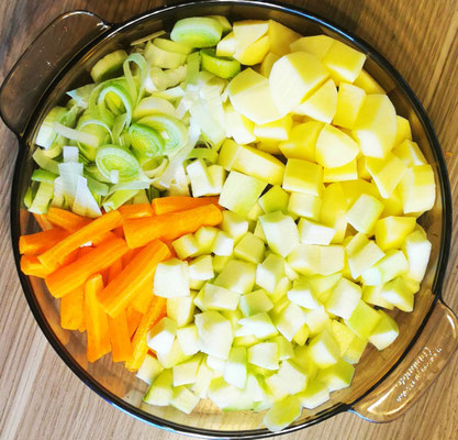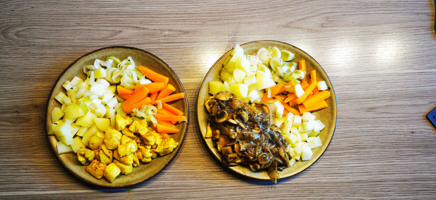 Zuchini 280 gr, Lauch 130 gr, Rübli 130 gr Kartoffeln 300gr, Pilze 200' gr, Zwiebeln 120 gr 480 gr Poulet Fleisch und 5 gr Braten Sauce sowie zum Dessert Trauben und Äpfel 160 gr.. Ergibt Total 1476 Kalorien.