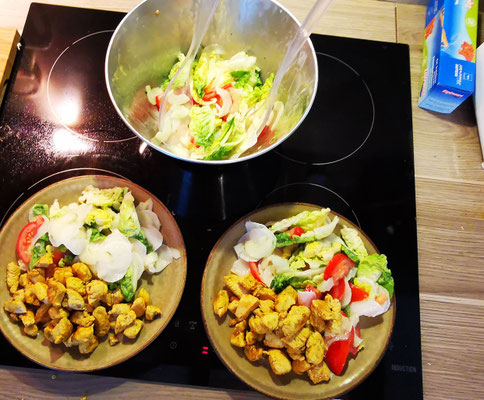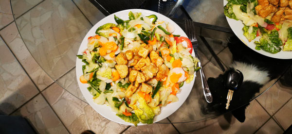 Tag 8: Gemischter Salat mit Poulewürfel.