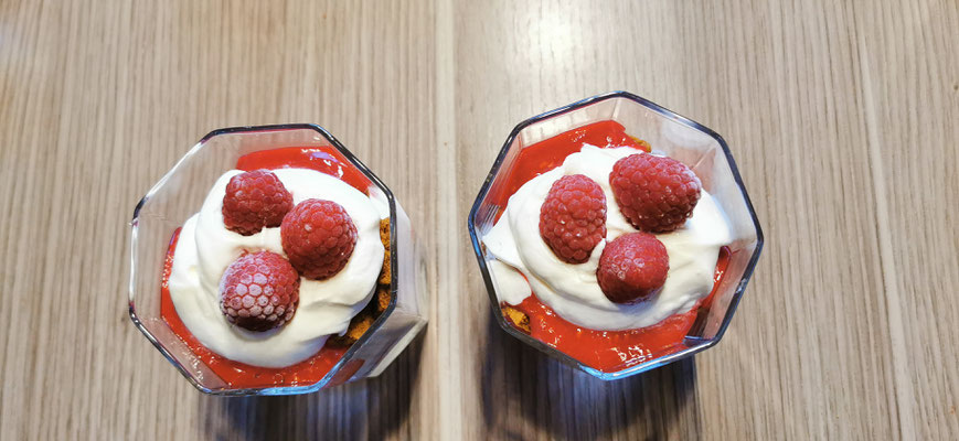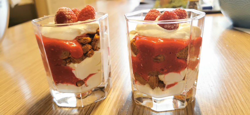 Nun in die bereitgestellten 8 Gläser abwechselnde Schichten von Mascarponecreme, pürierten Himbeeren und Spekulatius auffüllen, und mit Mascarponecreme abschliessen. Zum Schluss 3 ganze Himbeeren oben draufgeben zur Dekoration. Anschliessen mindestens 1 Stunde kühl stellen.
