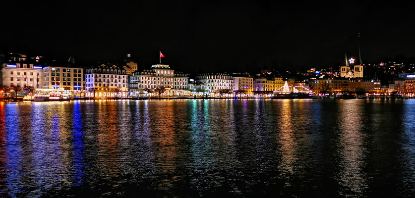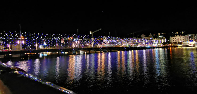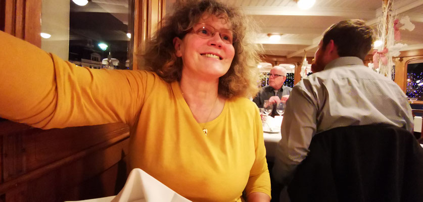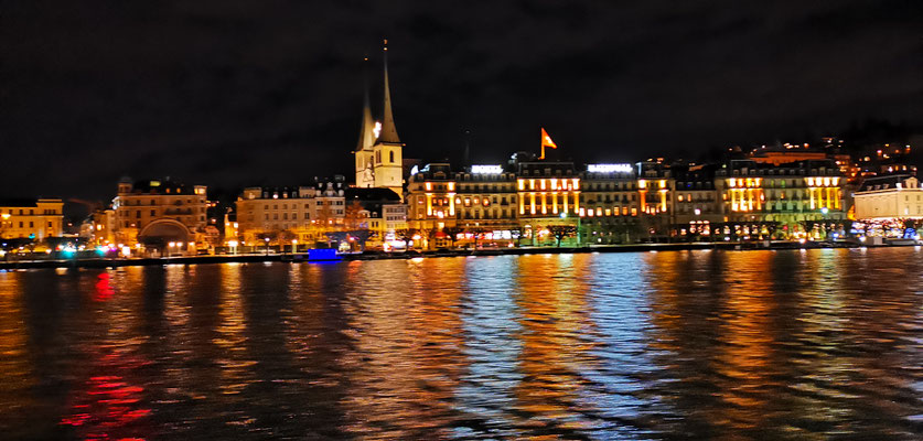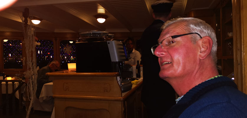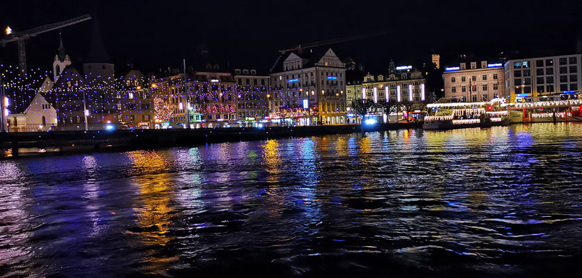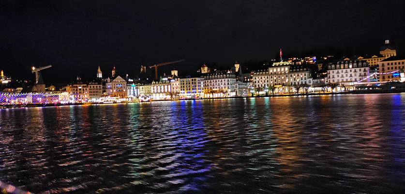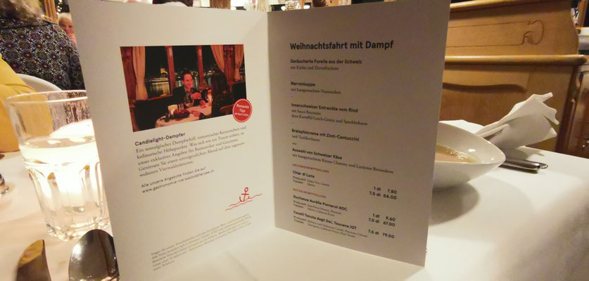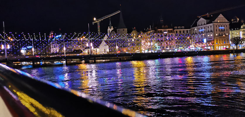 Da sein Bruder Böbi auf Reisen war, organosierte sein anderer Bruder Dänu eine Rad-Dampfer-Schifffahrt auf dem Vierwaldstättersee mit einem sehr gutem Nachtessen. Bei lauen Temperaturen und guter Launa trafen sie sich bei Dänu und parkten dann beim Frutishüsli, Dänus Werkstatt. Ein 15 Minütiger Fussmarsch zum See, und schon haben sie das Schiff erreicht. Sehr freundlicher Empfang und die Platzzuweisung eröffneten den Weihnachtsabend mit der entsprechenden Dekoration und Hintergrundmusik. Das Luzerner Seebecken erstrahlt im Lichterglanz ganz herrlich und verträumt. Nach der Begrüsung durch den Kapitän wurde auch schon die Vorspeise serviert. Der Hauptgang und das Dessert folgten folglich nach mit Pausen zwischendurch, welche sie mit Freigängen drausen,  die Rundsichten auf die üppig beleuchteten Uferpromenaden genossen.